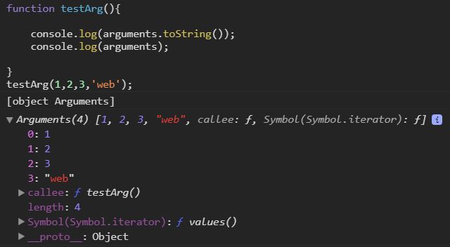 通过toString函数执行结果可以看出,arguments其实是“[object Arguments]”,其实将其直接打印出来的__proto__属性值就可以看出,arguments是Object。但是,这个arguments对象又跟我们看到的普通(正常)对象又有区别,因为一般的对象是大括号,而arguments对象是中括号,这一点又像数组。