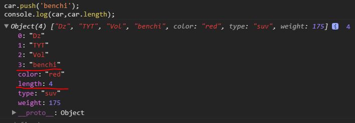 可以看到,push方法成功将新的元素添加到对象中,类数组car就创建完成了。