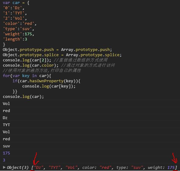 先从一个普通对象car开始,特别之处在于增加了数字作为属性,以及增加一个length属性,这样,我们就基本可以模拟出数组的使用方式了,并且仍然保持了对象的特性,如下图